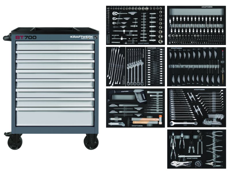 - 351 dílná základní sestava nářadí uložena ve 4 zásuvkách - 9 plně vybavené moduly nářadím řady Basic-Line - uloženo v pěnových EVA vložkách - dílenský vozík 8 zásuvek MADE IN GERMANY - pracovní plocha ABS odolná proti chemikáliím - děrovaný boční panel - robustní konstrukce s dvojitými stěnami - větší a zesílené zásuvky na kuličkových ložiscích, lehce pohyblivé - pojistka zabraňující současnému otevření více zásuvek - centrální zámek všech zásuvek na boku s cylindrickým zámkem
