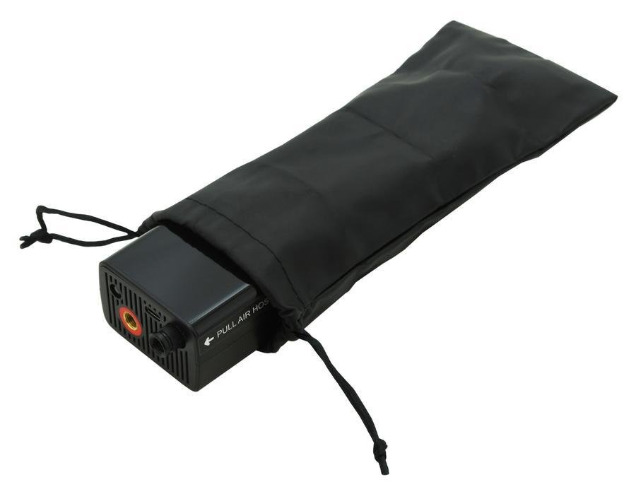 Napájení probíhá pomocí USB-C kabelu, přičemž průběh nabíjení je zobrazen na displeji. Husticí hadice je integrovaná v těle zařízení a po jejím vyjmutí se kompresor automaticky zapne. V přední části je umístěno LED světlo pro práci ve tmě.