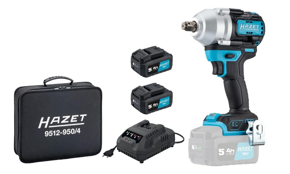 Součástí dodávky je 4dílná sada – samotný utahovák, 2 Li-Ion baterie 5 Ah, rychlonabíječka a praktické přepravní pouzdro Hazet.