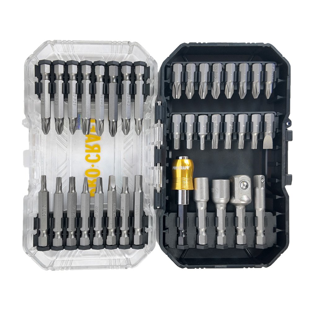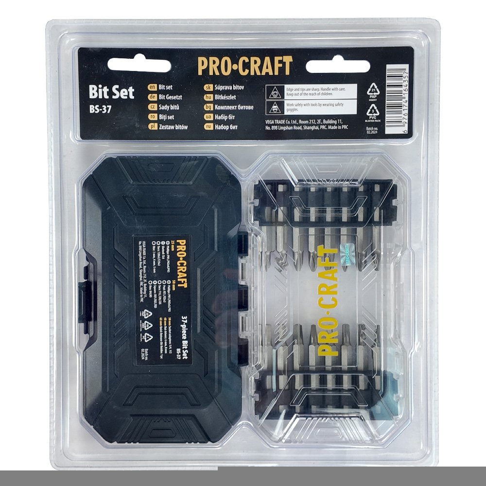 Sada bitů BS-37 v balení: 37 kvalitních bitů pro šroubování všech běžných typů spojů. 37dílná sada bitů Procraft BS-37 16 ks 25mm bitů: Phillips: PH1, PH2x6, PH, Ploche: SL6, Torx: T20x2, T25x2, Imbus: 3mm, 4mm, 5mm 16 ks 50mm bitů: Phillips: PH1, PH2x3, PH3, Pozi: PZ1, PZ2x2, Torx: T15, T20, T25, Square: SQ1, SQ2, SQ3, Imbus: H4, H5.