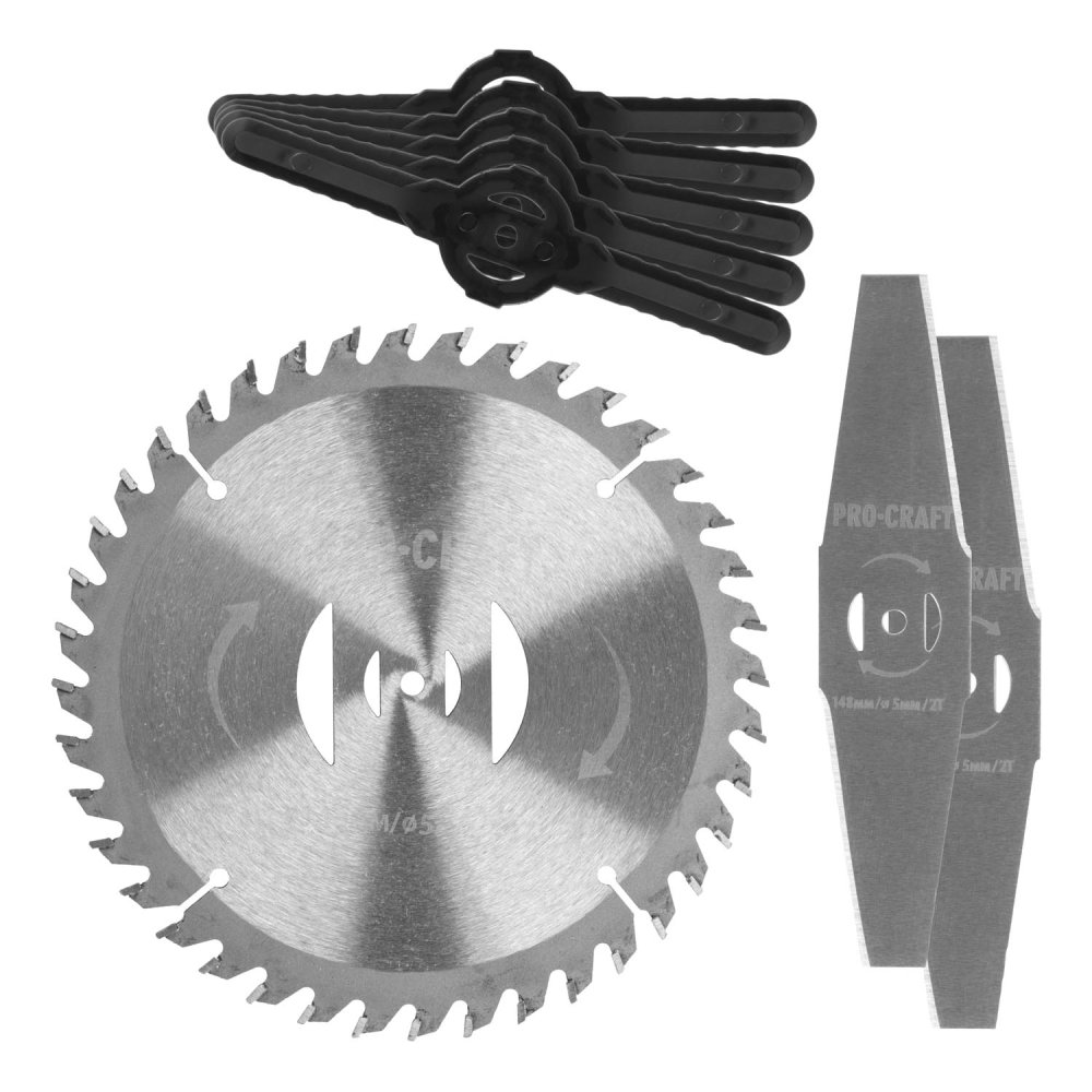 Aku vyžínač Procraft PTA24 s teleskopickou rukojetí a otočnou hlavou. Součástí balení jsou dvě baterie 20V 2Ah, nabíječka, 5 ks plastových čepelí, 2 ocelové nože a kotouč. Hmotnost 1,7 kg, otáčky 5500-8000/min.