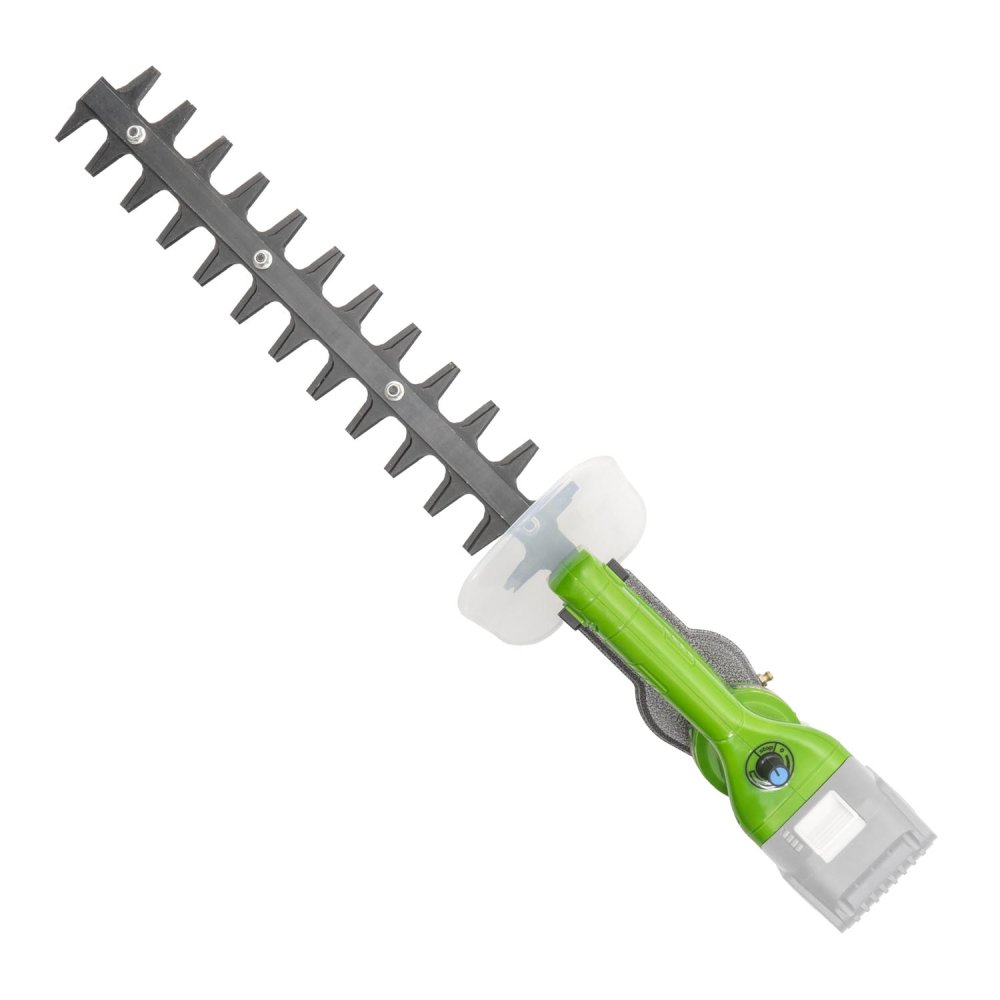 AKU jednoruční plotostřih zakřivený na tvarování a stříhání keřů s živých plotů do oblouků a kulatých tvarů se sílou nezaschlých výhonů až 20 mm. Možnost regulace plynulé frekvence střihu v závislosti na hustotě a síle porostu a požadavku na přesnost práce. Profesionální celokovové provedení. Stroj je dodávaný v kartonu s montážním klíčem a nádobou na mazací olej - bez akumulátoru a nabíječky.
