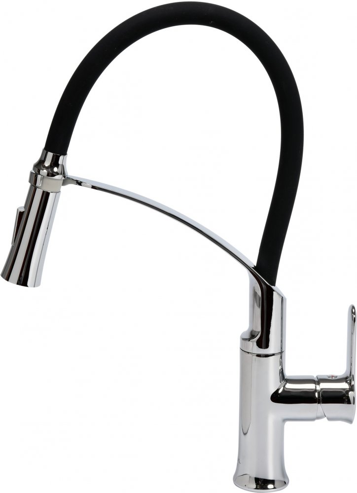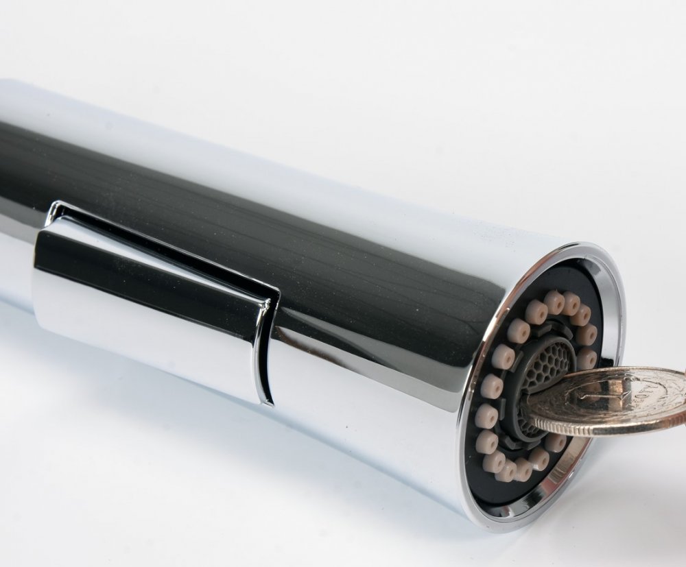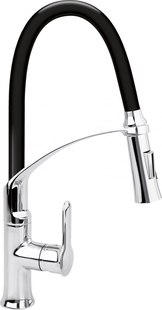Dřezová baterie z mosazi s jedinečnou konstrukcí s ohebnou hadicí a nastavitelnou tryskou.