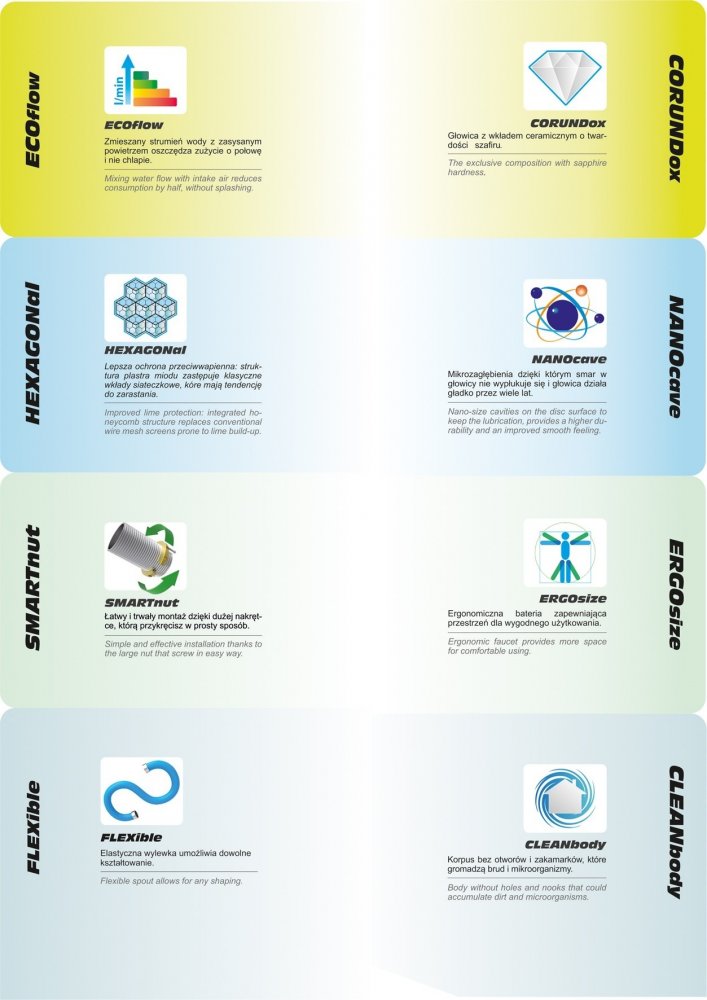 Baterie disponuje ergonomicky tvarovanou rukojetí, perlátorem švýcarské značky Neoperl. Baterie je opatřena keramickou kartuší se safírovou tvrdostí s mikroskopickými dutinami na povrchu, chránící mazivo před oplachem, baterie tak vydrží bez poruchy spoustu let.