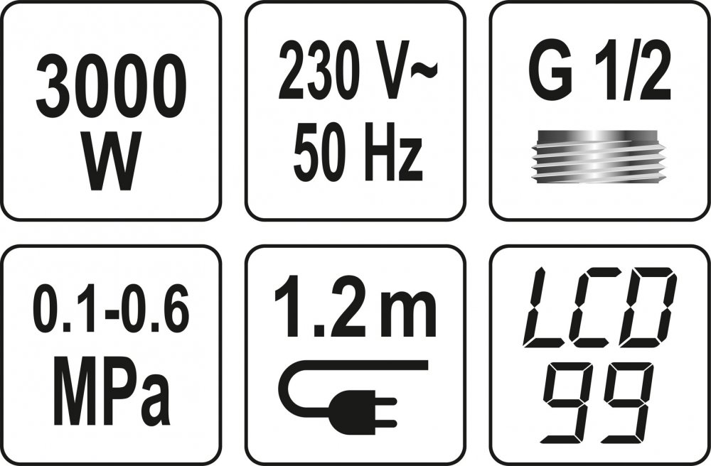 Průtokový ohřívač o výkonu 3000W, umožňuje ohřát vodu na 60 ° C za 5 sekund. Snadno čitelný LED displej, který umožňuje kontrolovat teplotu vody.