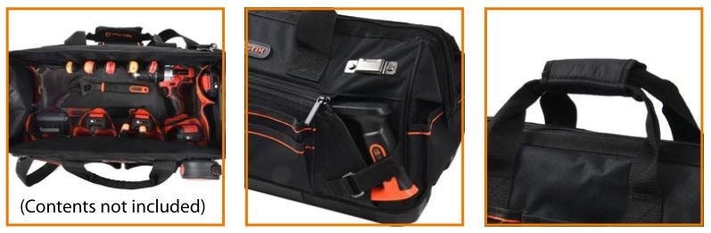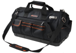 Brašna je vybavena velkou hlavní přihrádkou, která umožňuje snadný přístup k nářadí. Pevná plastová základna chrání obsah před vlhkostí a zajišťuje stabilitu i na nerovném povrchu.
