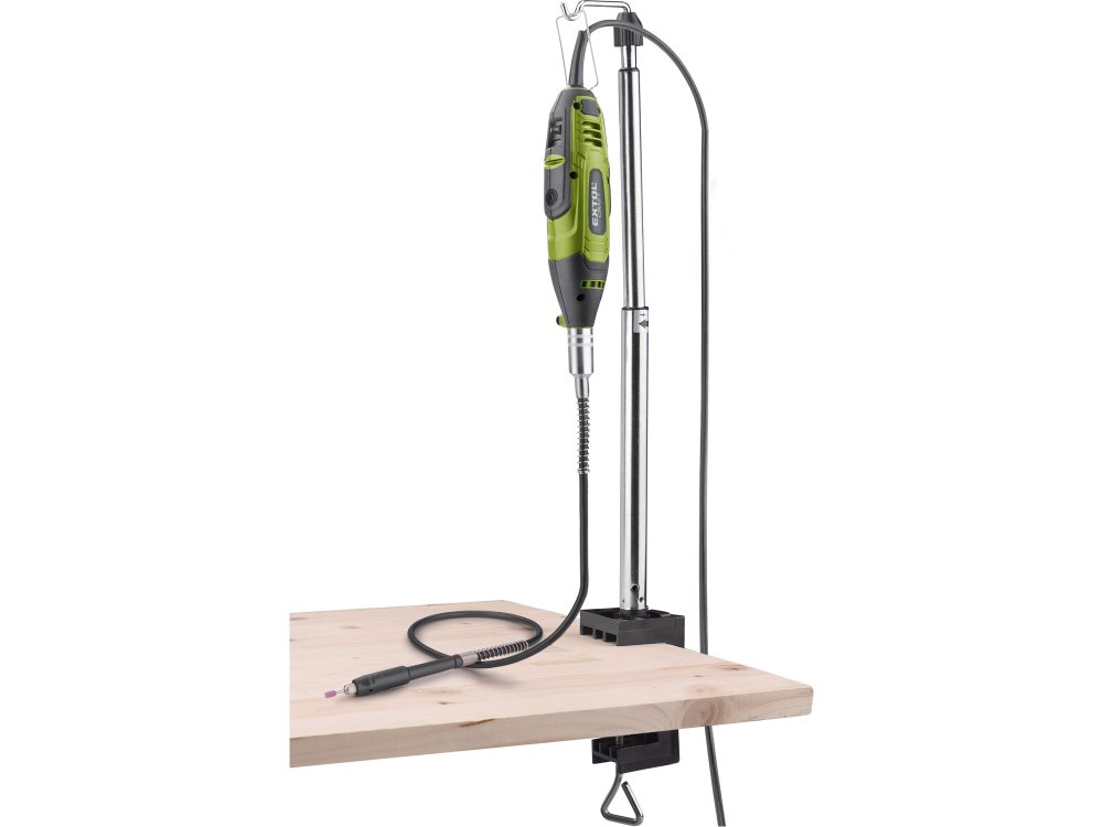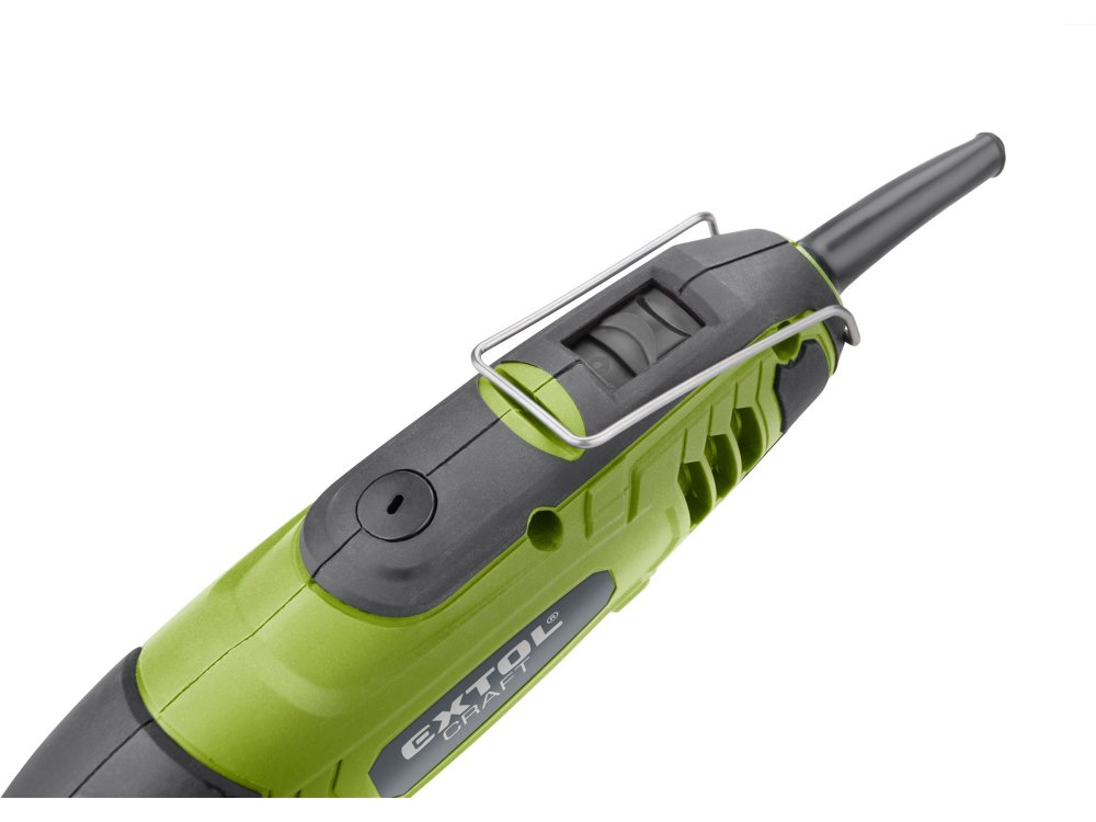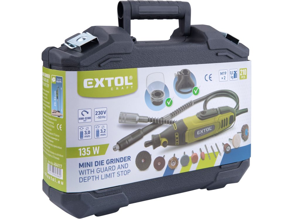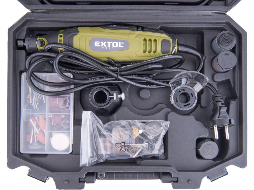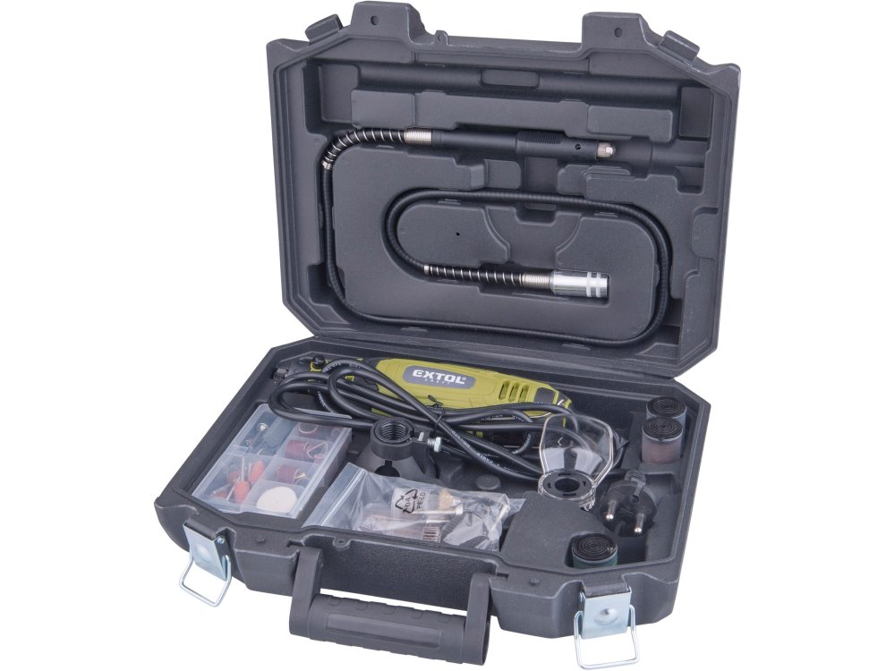 Malá bruska s řadou nástavců, určená k jemným gravírovacím pracím, preciznímu opracování dřeva, kovu či plastů a práci ve stísněných prostorech. Má ergonomický tvar a je pokrytá gumou v místech úchopu, což snižuje únavu při práci. Stroj umožňuje výměnu a montáž upínacích kleštin pro uchycení nástrojů s průměrem stopky 3 nebo 3,2 mm. Součástí balení je sada 210 kusů brusných a řezacích nástrojů ...