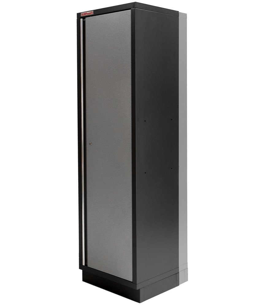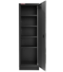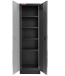 Úzká dílenská skříň, celokovová. Rozměry (Š x H x V): 600 x 610 x 2000 mm, centrální zámek, 4 výškově nastavitelné police, stavitelné nožičky, zpomalovací panty, odnímatelný přední sokl.