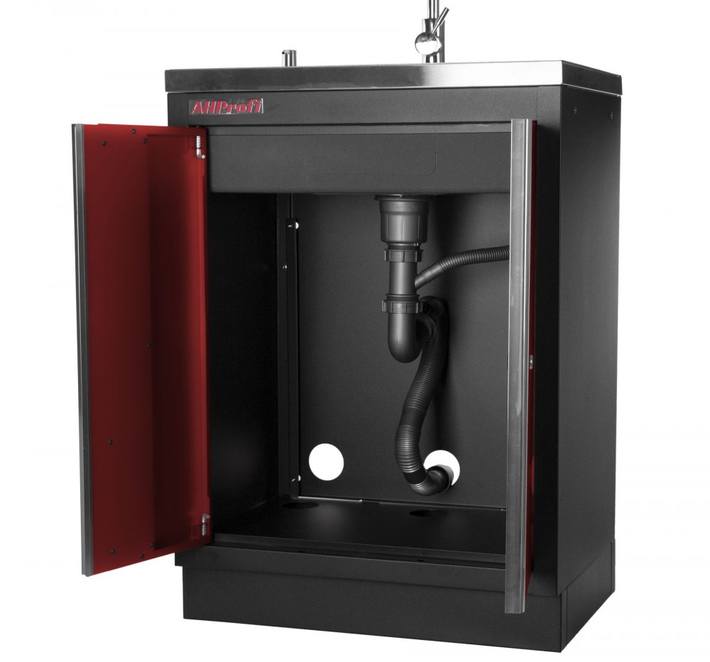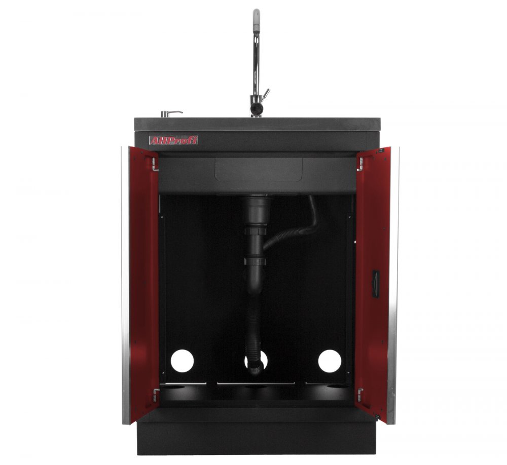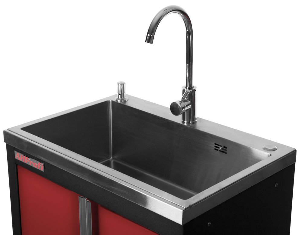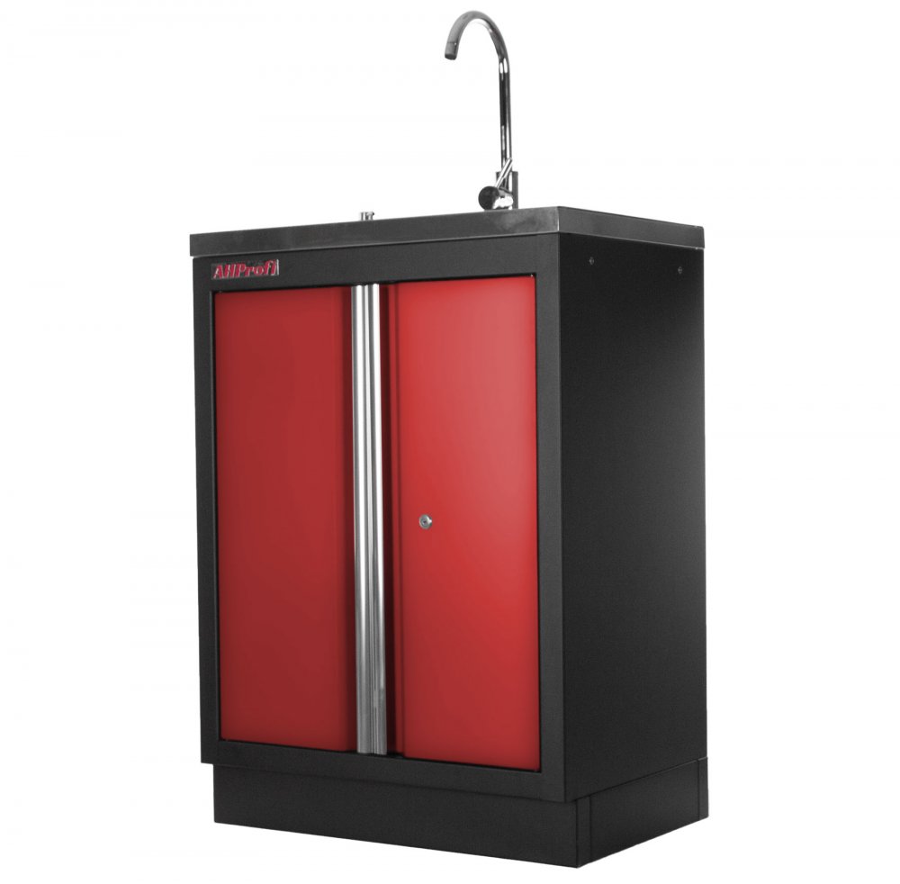Celokovová PROFI RED dílenská dvoukřídlá skříňka s vestavěným nerezovým dřezem a baterií.
