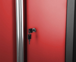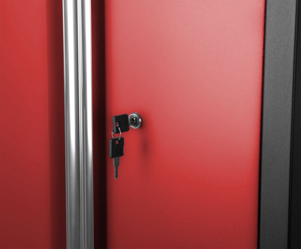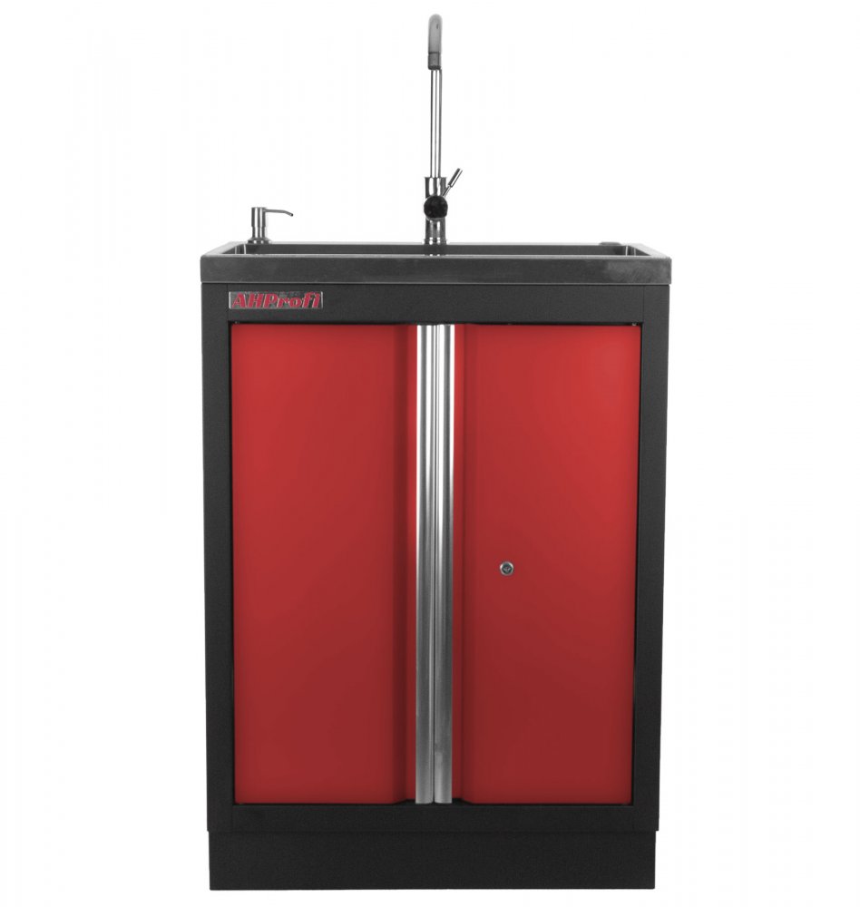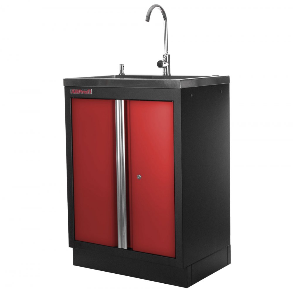 Celokovová PROFI RED dílenská dvoukřídlá skříňka s vestavěným nerezovým dřezem a baterií.