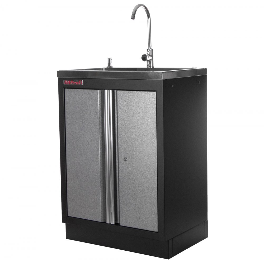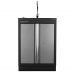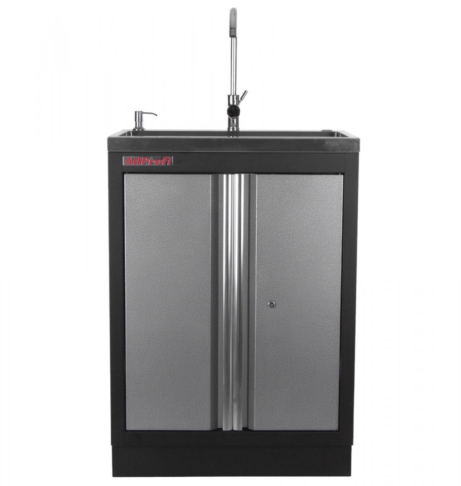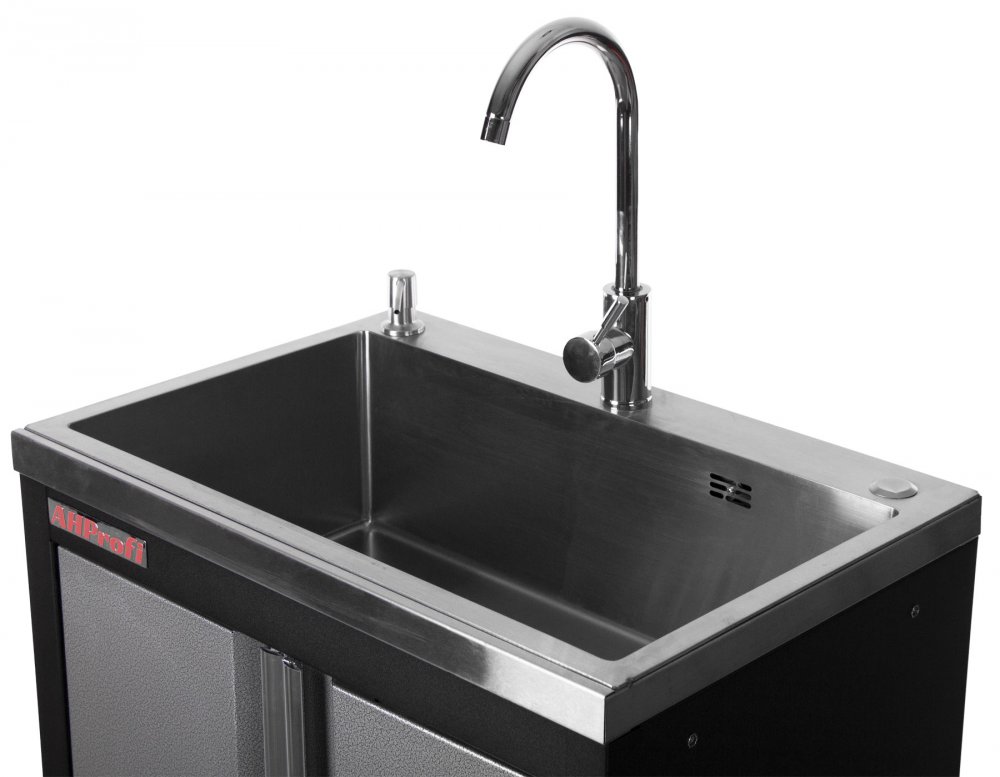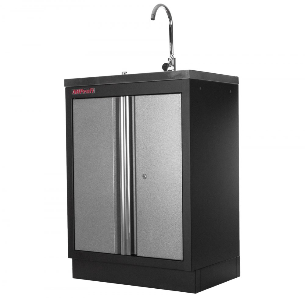 Celokovová PROFI dílenská dvoukřídlá skříňka s vestavěným nerezovým dřezem a baterií.