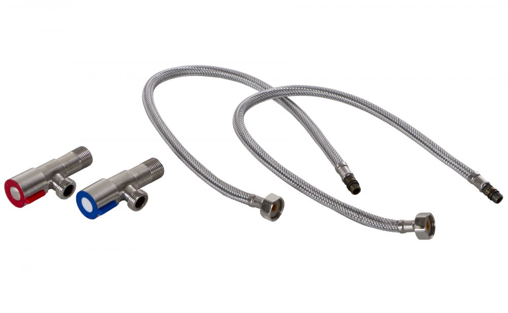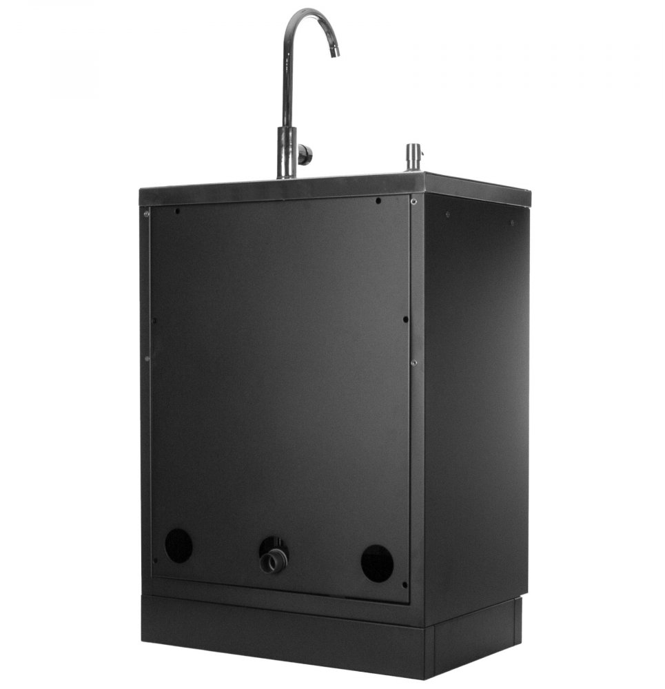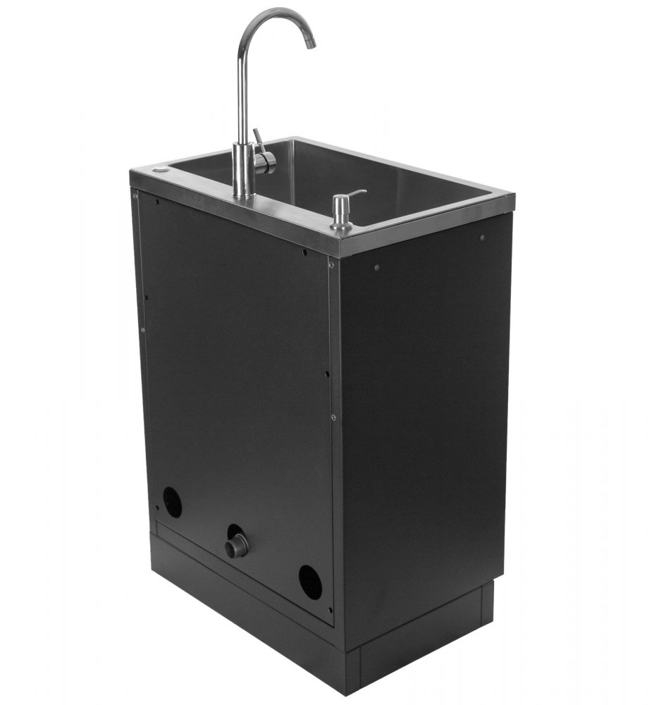 Kompletně vybavená skříňka s baterií, kterou lze umístit do jednoho z rohů nebo doprostřed nerezového dřezu.