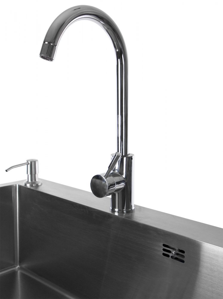 Součástí dřezu je také vestavěný dávkovač na mýdlo, kompletní odpad a příslušenství pro připojení teplé i studené vody.