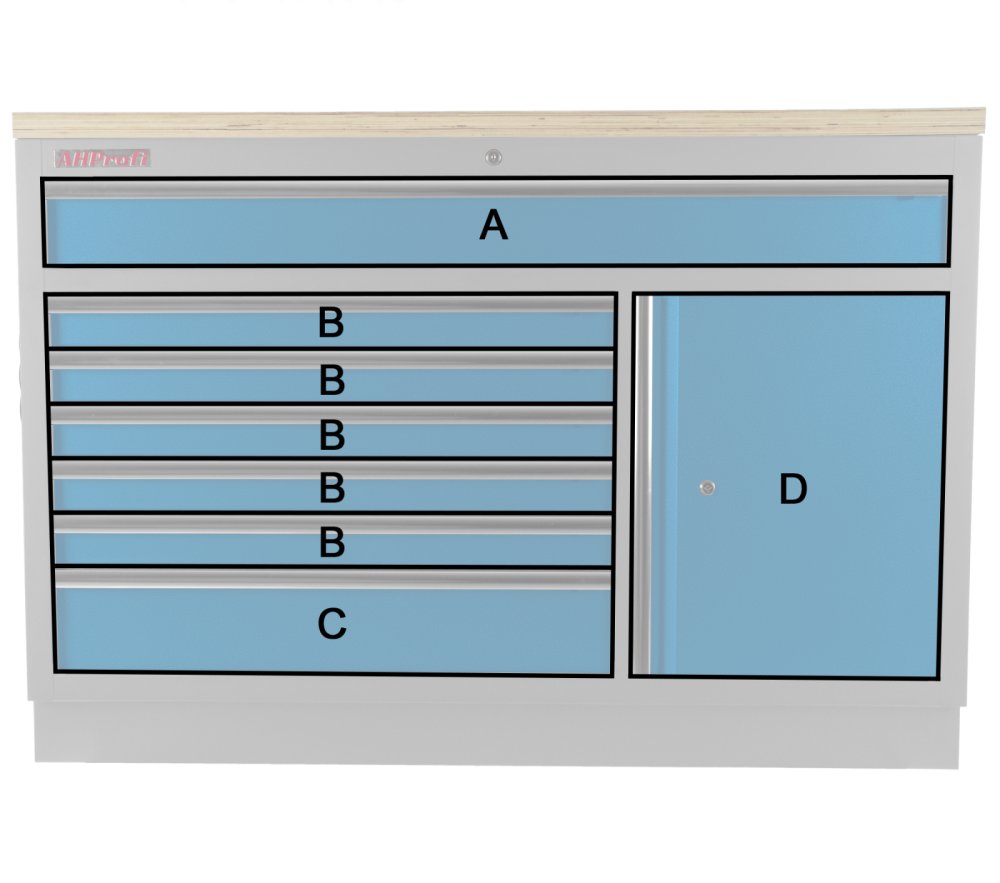 Na levé straně je celkem 6 zásuvek, které se hodí zejména pro ruční nářadí nebo výplně s nářadím, do spodní hlubší zásuvky lze uskladnit i větší nářadí.