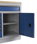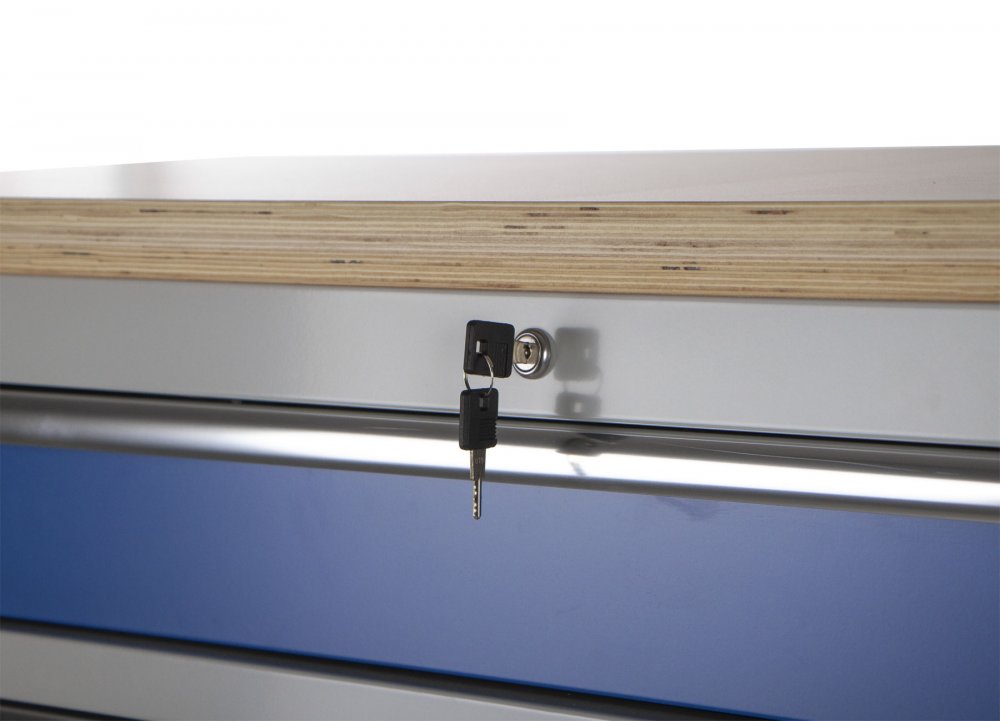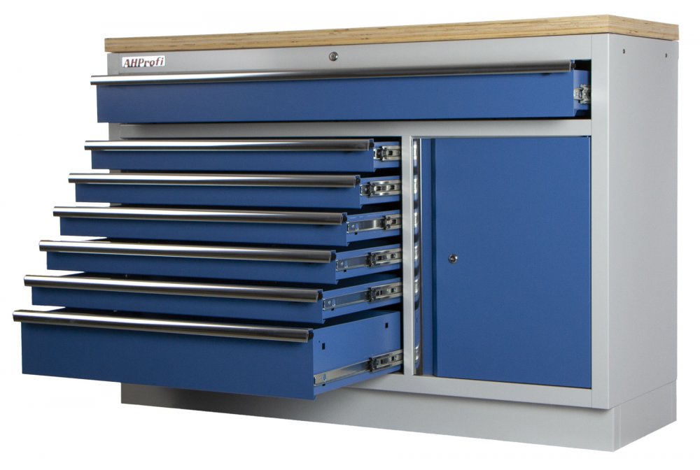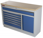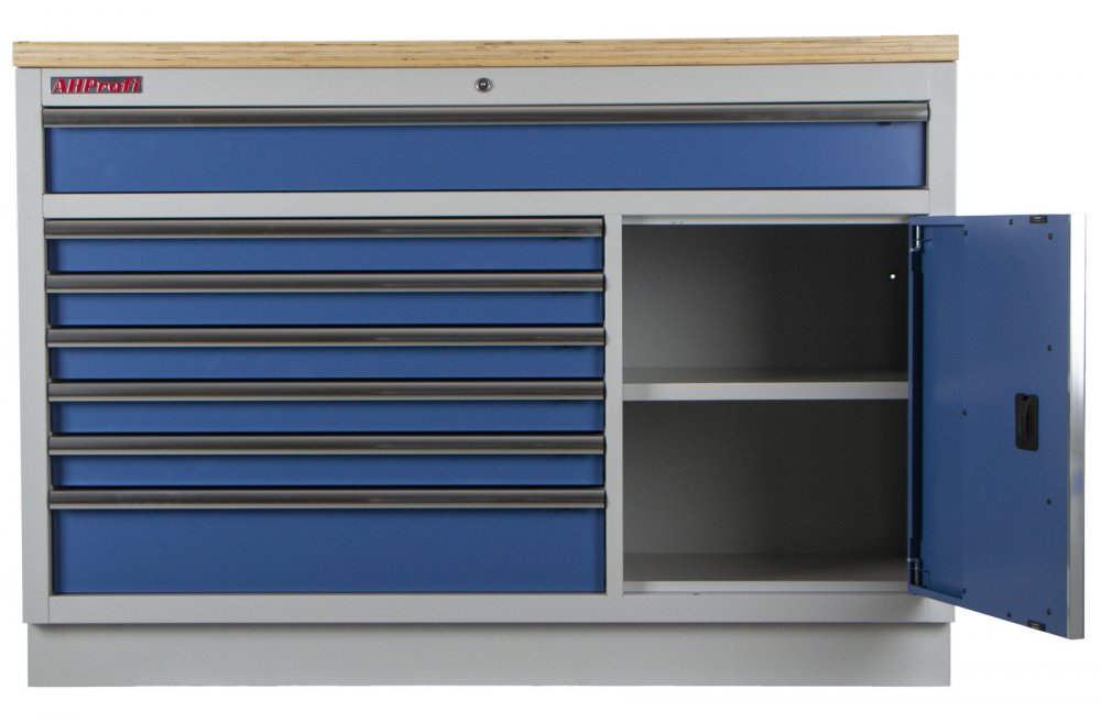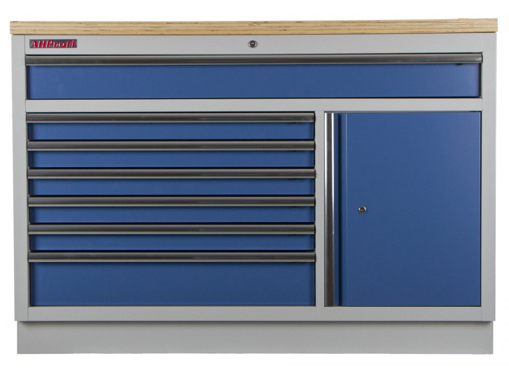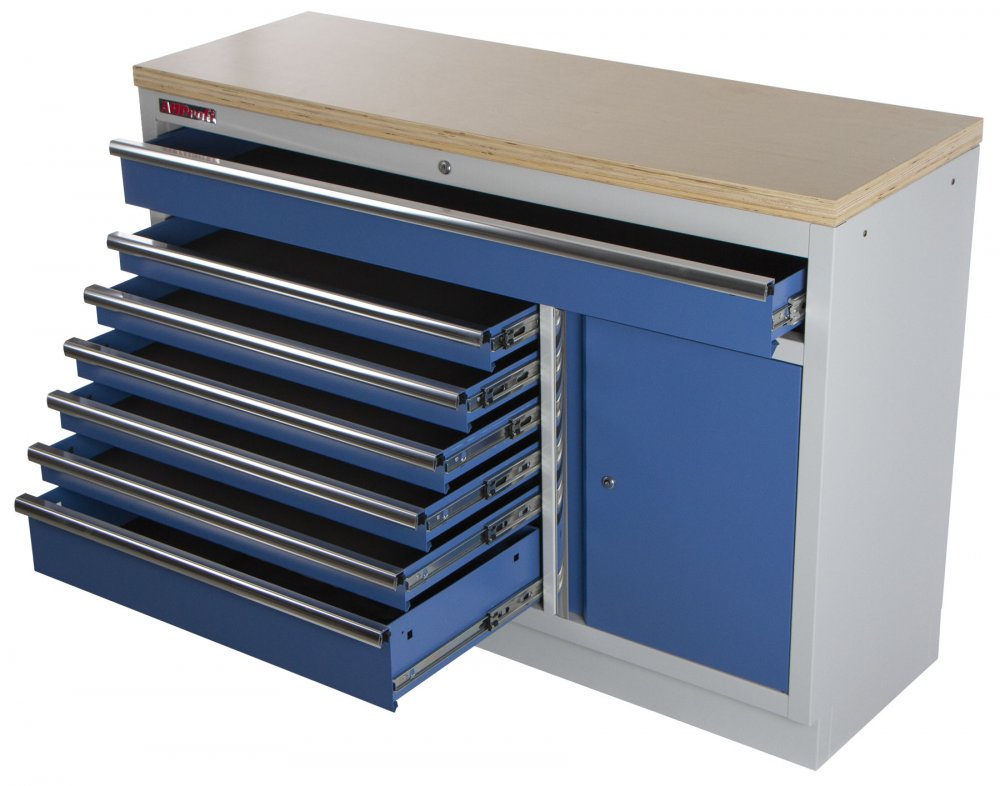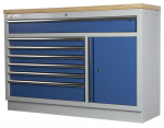 Široká celokovová dílenská skříňka se 7 zásuvkami, skříňkou a dřevěnou pracovní deskou.