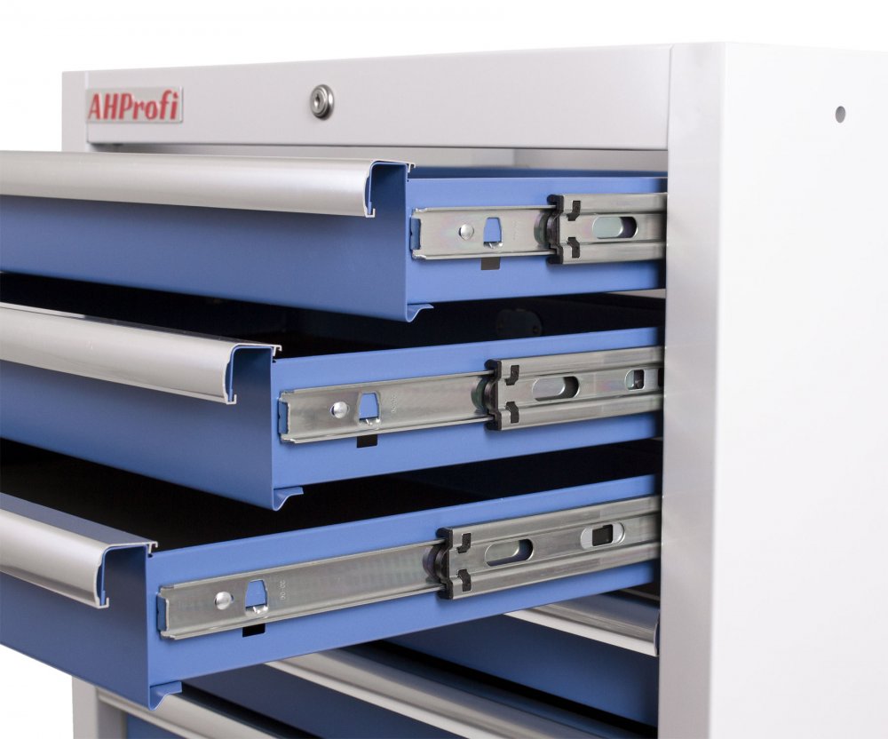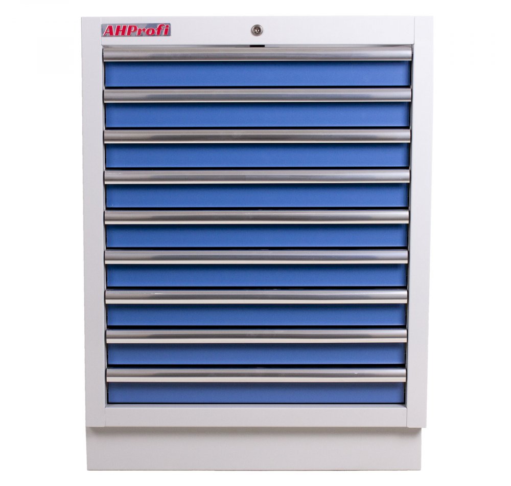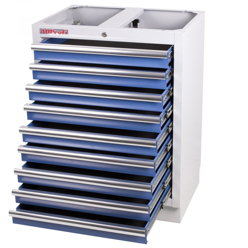 Celokovová PROFI dílenská skříňka s 9-ti zásuvkami. Prodává se i v rámci kvalitní PROFI 10ks sestavy dílenského nábytku TGS1300 nebo menších sestavách. Skříňka je vhodná do profesionálních servisů, dílen, ale také do garáží pro uskladnění širokého sortimentu zboží i ručního nářadí, na které se pak nepráší a snáze se udrží přehledně uklizené na správném místě.