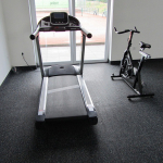 Gumová dlažba (modulová podlaha) FLOMA FitFlo SF1050 se systémem puzzle zámků je ideální podlahou do domácích posiloven a fitness (profesionální fitness centra obvykle volí výšku 1,6 cm). Velice dobře absorbuje nárazy, pády při cvičení, zmírňují dopady činek a cvičícího nářadí. Nespornou výhodou materiálu je také šetrnost ke kloubnímu aparátu cvičence. Tato gumová podlahovina se dá použít jako celoplošná podlaha do domacích fitness, jako pochůzné plochy v posilovnách, jako podložky pod cvičící stroje, odkládací plochy pro činky a další.