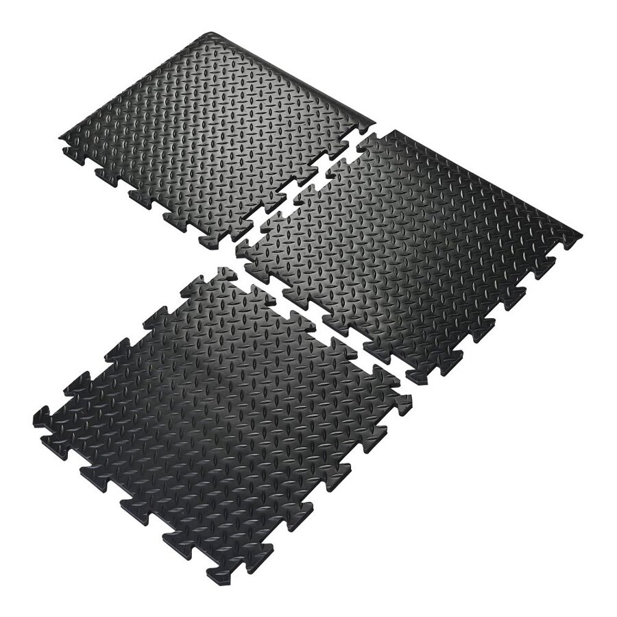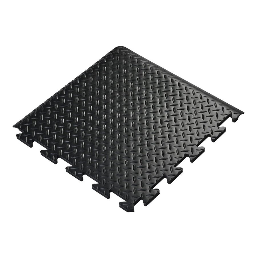 Povrch dlažby s diamantovým vzorem je vyroben z tvrzeného PVC nabízející dobrou mechanickou i chemickou odolnost. Pěnová rubová strana dlažby zmírňuje únavu při dlouhodobém stání a chrání pracovníky před negativními vlivy studených betonových podlah.