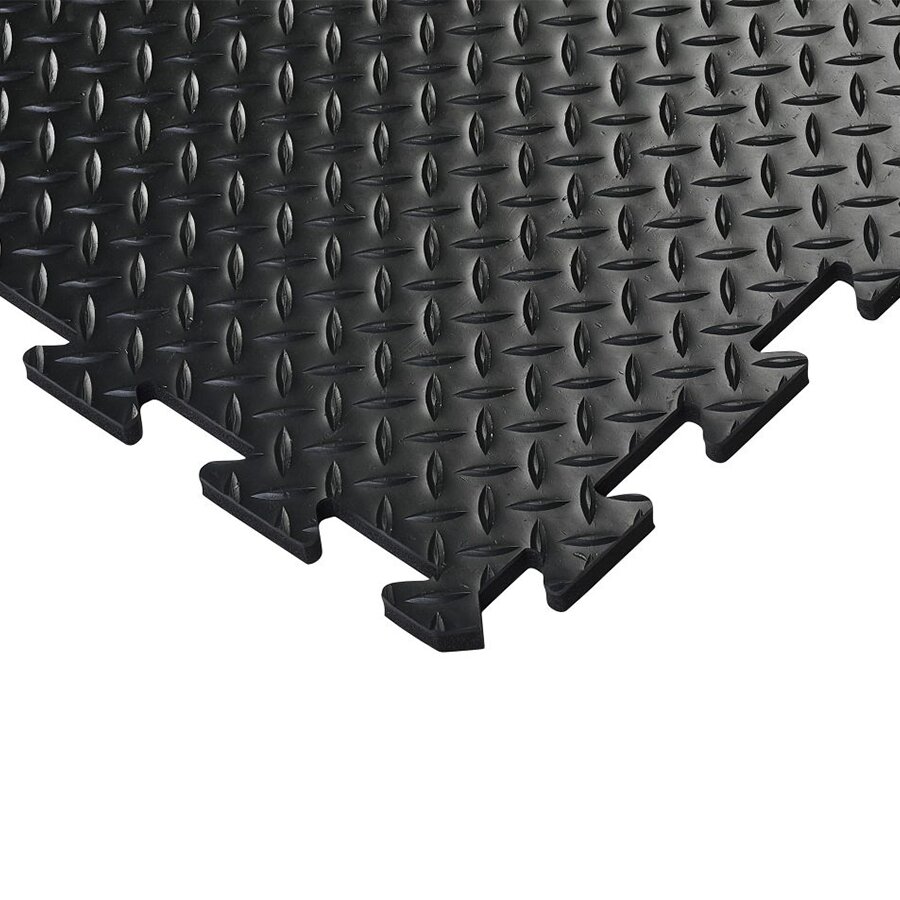 Povrch dlažby s diamantovým vzorem je vyroben z tvrzeného PVC nabízející dobrou mechanickou i chemickou odolnost. Pěnová rubová strana dlažby zmírňuje únavu při dlouhodobém stání a chrání pracovníky před negativními vlivy studených betonových podlah.