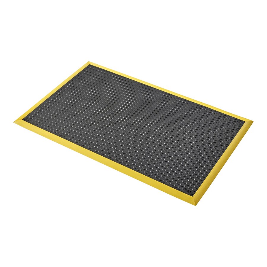 Má reliéfní design s diamantovým vzorem, který poskytuje vynikající trakci a zabraňuje uklouznutí. Zkosené žluté okraje na všech čtyřech stranách snižují riziko zakopnutí. rohož je také odolná vůči olejům a chemikáliím a lze ji snadno čistit.