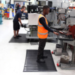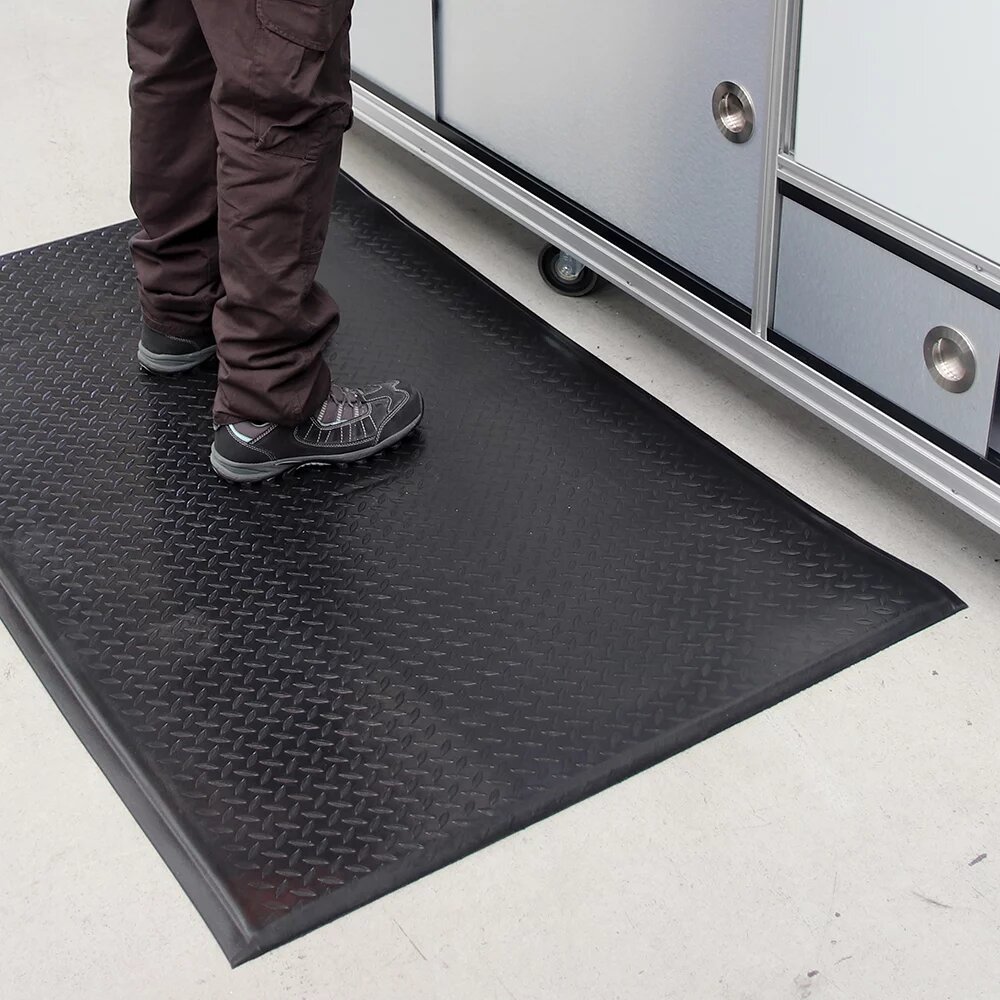PVC protiúnavová rohož FLOMA Plus s diamantovým vzorem, který zajištuje prevenci uklouznutí. Rohož svou výškou a zvoleným materiálem příznivě snižuje účinky dlouhodobého stání pracovníků na stejném místě, uvolněním tlaku na chodidla, nohy i záda a podporuje tak proudění krve v těle.