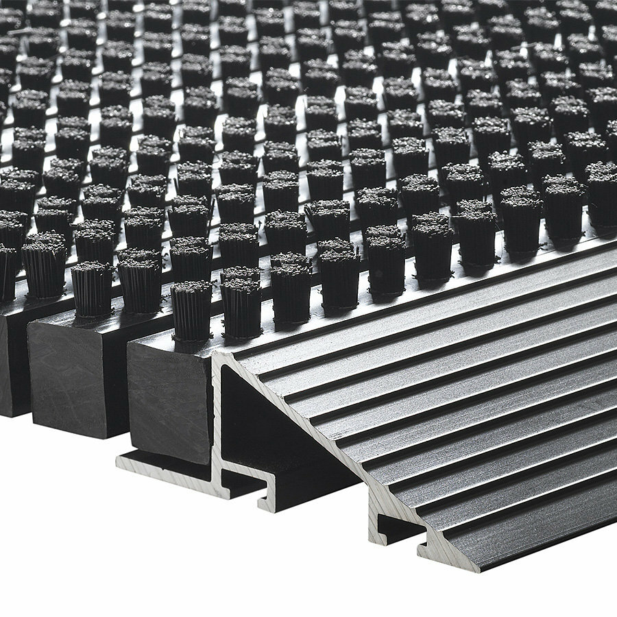 Kvalitní vstupní čistící rohož Outline s kartáčovacím efektem a hliníkovým nájezdem, vyznačující se dlouhou životností pro všechny vstupní prostory. Vstupní rohož má vynikající čisticí vlastnosti díky nylonovým kartáčům, prvotřídní zpracování s extrémní odolnosti vůči povětrnostním vlivům, plísním, tlení a zápachu.