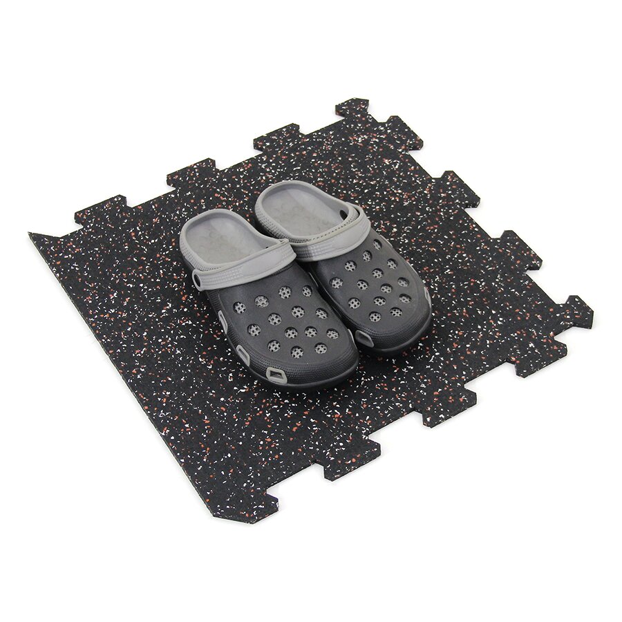 Gumová dlažba (modulová podlaha) FLOMA FitFlo SF1050 s příměsí 5+5% EPDM barevného granulátu v provedení 5% bílá + 5% červená je ideální podlahou do domácích posiloven a fitness (profesionální fitness centra obvykle volí výšku 1,6 cm). Velice dobře absorbuje nárazy, pády při cvičení, zmírňují dopady činek a cvičícího nářadí. Nespornou výhodou materiálu je také šetrnost ke kloubnímu aparátu cvičence. Tato gumová podlahovina se dá použít jako celoplošná podlaha do domacích fitness, jako pochůzné plochy v posilovnách, jako podložky pod cvičící stroje, odkládací plochy pro činky a další.