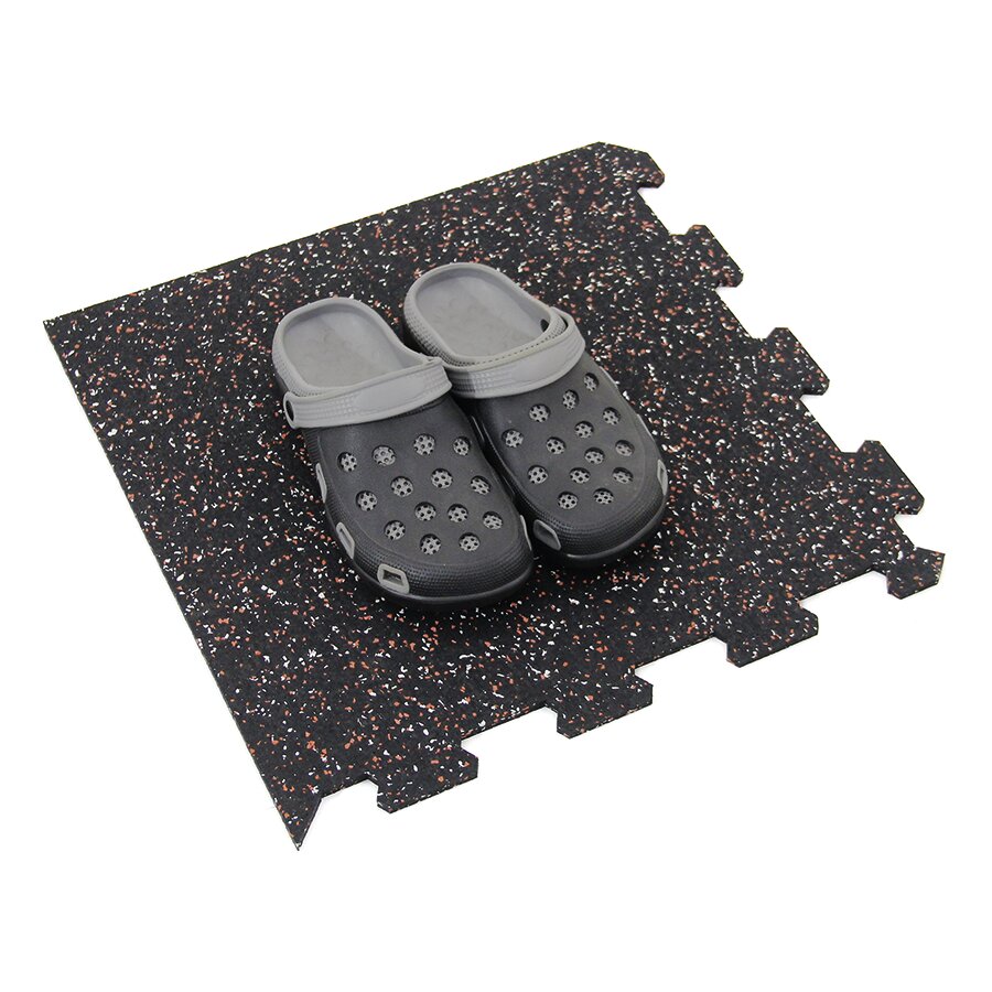 Gumová dlažba (modulová podlaha) FLOMA FitFlo SF1050 s příměsí 5+5% EPDM barevného granulátu v provedení 5% bílá + 5% červená je ideální podlahou do domácích posiloven a fitness (profesionální fitness centra obvykle volí výšku 1,6 cm). Velice dobře absorbuje nárazy, pády při cvičení, zmírňují dopady činek a cvičícího nářadí. Nespornou výhodou materiálu je také šetrnost ke kloubnímu aparátu cvičence. Tato gumová podlahovina se dá použít jako celoplošná podlaha do domacích fitness, jako pochůzné plochy v posilovnách, jako podložky pod cvičící stroje, odkládací plochy pro činky a další.