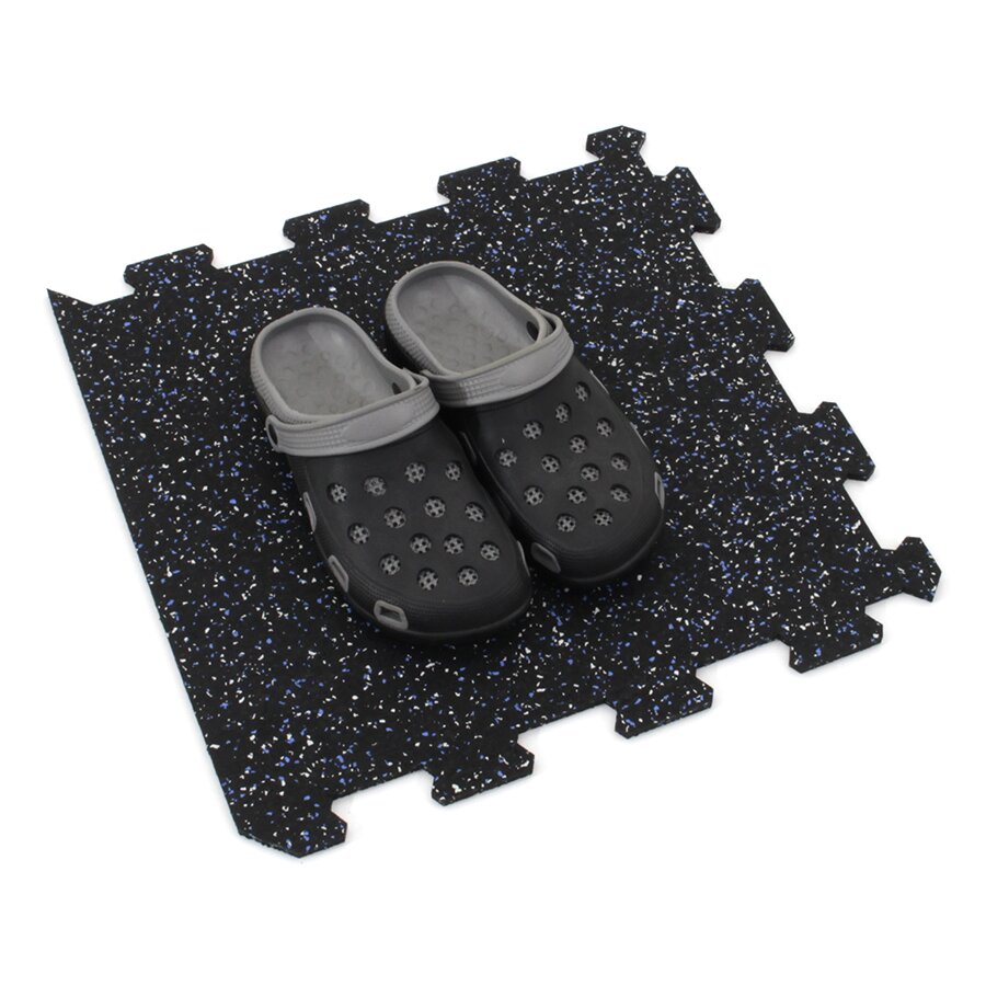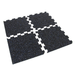 Gumová dlažba (modulová podlaha) FLOMA FitFlo SF1050 s příměsí 5+5% EPDM barevného granulátu v provedení 5% bílá + 5% modrá je ideální podlahou do domácích posiloven a fitness (profesionální fitness centra obvykle volí výšku 1,6 cm). Velice dobře absorbuje nárazy, pády při cvičení, zmírňují dopady činek a cvičícího nářadí. Nespornou výhodou materiálu je také šetrnost ke kloubnímu aparátu cvičence. Tato gumová podlahovina se dá použít jako celoplošná podlaha do domacích fitness, jako pochůzné plochy v posilovnách, jako podložky pod cvičící stroje, odkládací plochy pro činky a další.