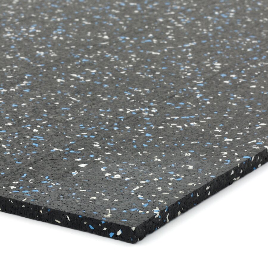 Gumová dlažba (modulová podlaha) FLOMA FitFlo SF1050 s příměsí 5+5% EPDM barevného granulátu v provedení 5% bílá + 5% modrá je ideální podlahou do domácích posiloven a fitness (profesionální fitness centra obvykle volí výšku 1,6 cm). Velice dobře absorbuje nárazy, pády při cvičení, zmírňují dopady činek a cvičícího nářadí. Nespornou výhodou materiálu je také šetrnost ke kloubnímu aparátu cvičence. Tato gumová podlahovina se dá použít jako celoplošná podlaha do domacích fitness, jako pochůzné plochy v posilovnách, jako podložky pod cvičící stroje, odkládací plochy pro činky a další.