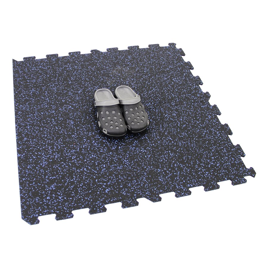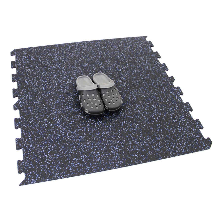 Gumová dlažba (modulová podlaha) FLOMA FitFlo SF1050 s příměsí 10% EPDM barevného granulátu v provedení 10% modrá je ideální podlahou do domácích posiloven a fitness (profesionální fitness centra obvykle volí výšku 1,6 cm). Velice dobře absorbuje nárazy, pády při cvičení, zmírňují dopady činek a cvičícího nářadí. Nespornou výhodou materiálu je také šetrnost ke kloubnímu aparátu cvičence. Tato gumová podlahovina se dá použít jako celoplošná podlaha do domacích fitness, jako pochůzné plochy v posilovnách, jako podložky pod cvičící stroje, odkládací plochy pro činky a další.