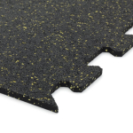 Gumová dlažba (modulová podlaha) FLOMA FitFlo SF1050 s příměsí 10% EPDM barevného granulátu v provedení 10% žlutá je ideální podlahou do domácích posiloven a fitness (profesionální fitness centra obvykle volí výšku 1,6 cm). Velice dobře absorbuje nárazy, pády při cvičení, zmírňují dopady činek a cvičícího nářadí. Nespornou výhodou materiálu je také šetrnost ke kloubnímu aparátu cvičence. Tato gumová podlahovina se dá použít jako celoplošná podlaha do domacích fitness, jako pochůzné plochy v posilovnách, jako podložky pod cvičící stroje, odkládací plochy pro činky a další.