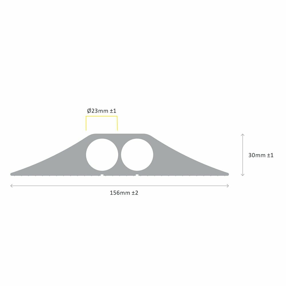 Kabelový most s drážkou pro 2 kabely slouží jako ochrana kabelů ve výrobních provozech, na výstavách, kulturních akcích atd. Tedy perfektní volbou pro ochranu kabelů v interiérech či exteriérech. Díky své šikmé hraně chrání kabely před kolovou dopravou jako jsou automobily a vysokozdvižné vozíky. Velký průměr kanálů o průměru 2,3 cm jsou vhodné pro vysoce namáhávé kabely. Nabízí vysokou nosnost, snadnou údržba, rychlou montáž a demontáž, protiskluznost a stabilitu. Tento kabelový most disponuje předřezanou štěrbinou na zadní straně pro snadné vkládání kabelů.