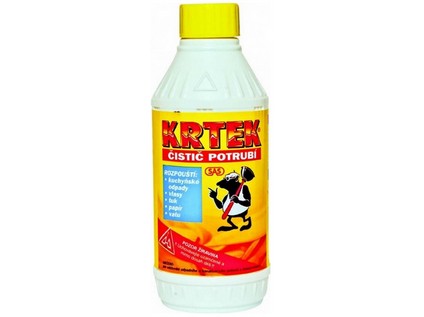 Odstraňuje vlasy, chlupy, zbytky potravin, tuky, vatu.Signální slova (CLP):NEBEZPEČÍStandardní věta o nebezpečnosti (CLP):Uchovávejte mimo dosah dětíPřed použitím přečtěte tento výstražný štítekStandardní věta o nebezpečnosti: H-290 Může být korozivní pro kovy.H-314 Způsobuje těžké poleptání kůže a poškození očí.Pozor: Může dojít k bouřlivé reakci a roztok z výlevky může vystříknout a způsobit poleptání rukou. Při aplikaci přípravku vždy používejte gumové rukavice a obličejový štít. Nikdy nevysypávejte větší množství Krtka do sifonu. Nebezpečí! obsahuje hydroxid sodný, Způsobuje těžké poleptání kůže a poškození očí. Uchovávejte mimo dosah dětí. Nevdechujte dýmy/mlhu/páry/rozprášenou tekutiny. Po manipulaci důkladně omyjte velkým množstvém vody. Používejte ochranné rukavice/ochranný oděv/ochranné brýle/obličejový štít. Při požití vypláchněte ústa. Nevyvolávejte zvracení. Při styku s kůží nebo s vlasy veškeré kontaminované části oděvu okamžitě svlékněte. Opláchněte kůži vodou/osprchujte. Při zasažení očí několik minut opatrně vyplachujte vodou. Vyjměte kontaktkní čočky, jsou-li nasazeny, a pokud je lze vyjmout snadno. Pokračujre ve vyplachování. Při vdechnutí zajistěte čertsvý vzduch. Při pravidelném dýchání nebo jeho zástavě provádějte umělé dýchání. Ihned přivolejte lékaře.