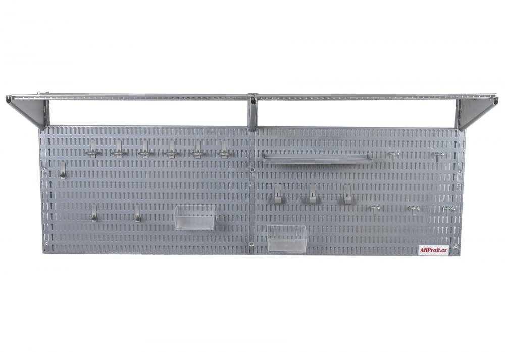 Součástí sestavy jsou 2 police, misky i háčky s roztečí 13 x 13 mm. Snadná montáž děrované desky zjednodušší úklid pracovního prostoru a následně přehledně naleznete nejčastěji používané ruční nářadí.