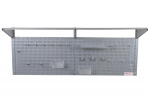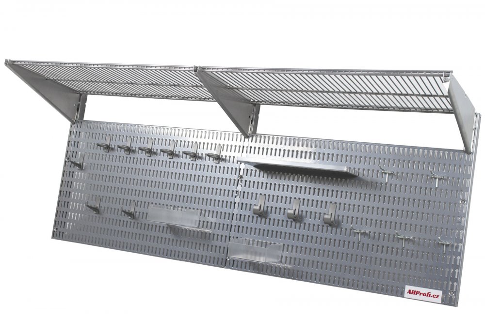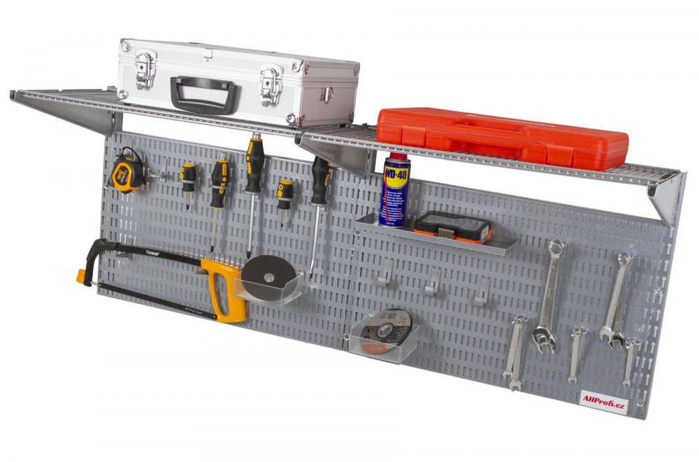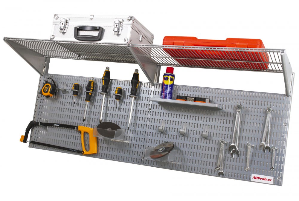 Děrovaná deska s komplexním příslušenstvím pro zavěšení nářadí a spojovacího materiálu, či police pro umístění větších přístrojů (např. v kufrech nebo krabicích).