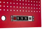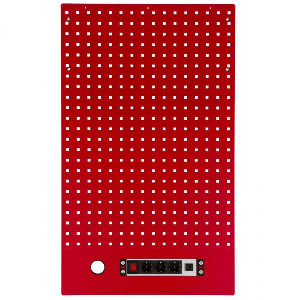 Děrovaná závěsná deska PROFI RED s elektrickou zásuvkou. Může být použita samostatně, případně do setu se stojícími nebo závěsnými dílenskými skříňkami. V našem sortimentu naleznete velké množství háčků, díky kterým se snáze udrží nářadí přehledně uklizené na správném místě.