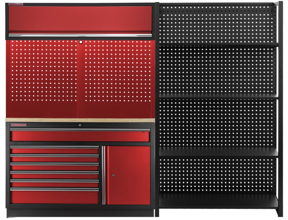 Sestava PROFI RED dílenského nábytku s jedním širokým regálem je vhodnou alternativou do menších prostor.