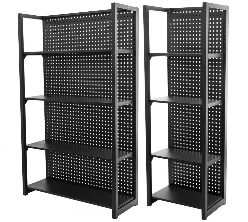 Stabilitu regálů zajišťují bočnice a zadní děrovaná deska, kterou lze také využít pro zavěšení drobného nářadí pomocí háčků (nářadí a háčky nejsou součástí balení).