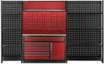 Sestava PROFI RED dílenského nábytku s jedním úzkým a jedním širokým regálem je vhodnou alternativou do menších prostor.