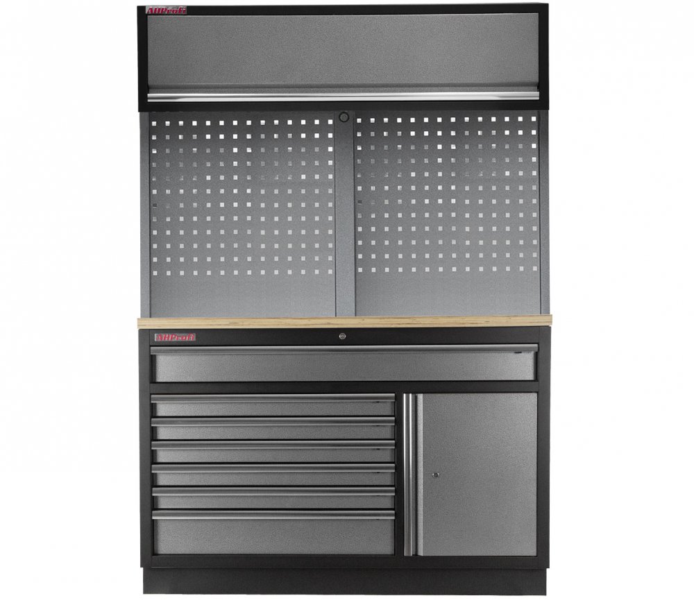 Spodní široká celokovová dílenská skříňka se 7 zásuvkami, skříňkou a dřevěnou pracovní deskou.