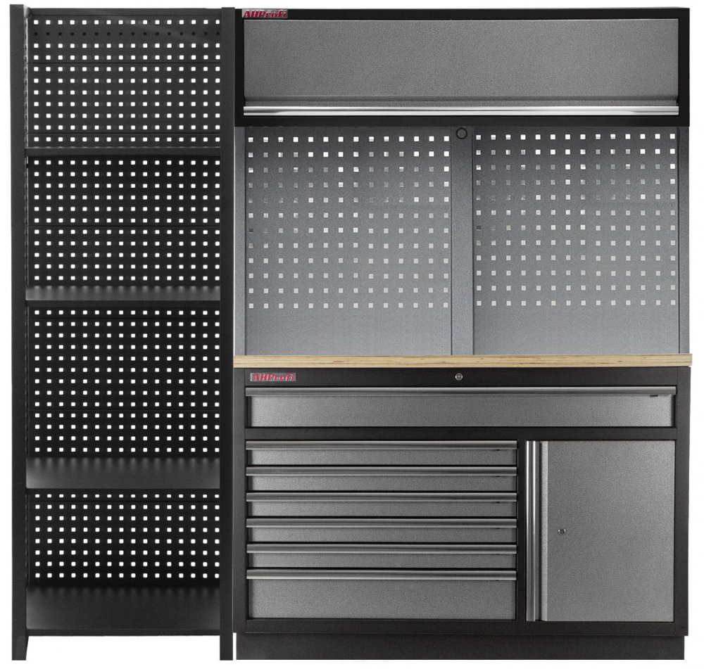 Sestava PROFI dílenského nábytku s jedním úzkým regálem je vhodnou alternativou do menších prostor.