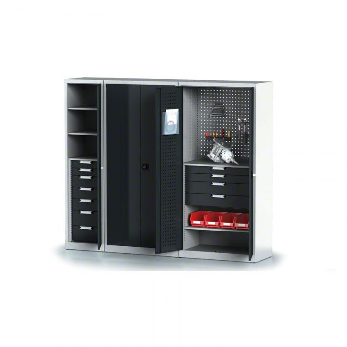 Korpus dílenské/kancelářské skříně je svařen z ocelového plechu, který dává dostatečnou tuhost celé skříni, která tak má nosnost až 600 kg. Vnitřní strana dveří je opatřena děrovanou závěsnou deskou EUROPERFO perforací pro instalaci držáků ručního nářadí a dílenského vybavení. Dle varianty je závěsný systém EUROPERFO instalován do horní části zadní stěny dílenské skříně. Dveře jsou uloženy v masívních čepech s úhlem otevření 110 stupňů s výztuhou. Tříbodový cylindrický zámek s otočnou rukojetí se dvěma klíči dodává velkou bezpečnost před nezvaným otevřením. Police s nosností 80 kg jsou přestavitelné po 25 mm. Zásuvky mají plošnou nosnost 40 kg se 100% výsuvem. Do zásuvek je možné instalovat děliče v příčném směru.