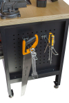 K děrované desce stolu můžete přikoupit různé druhy háčků a nářadí si na boční desku jednoduše pověsíte.