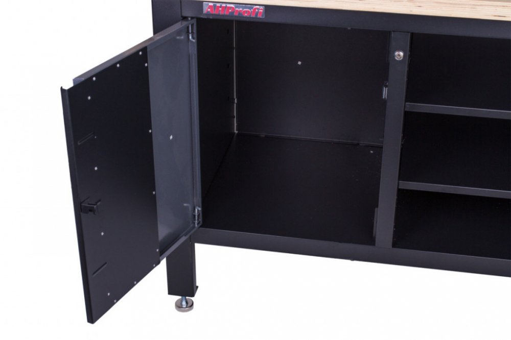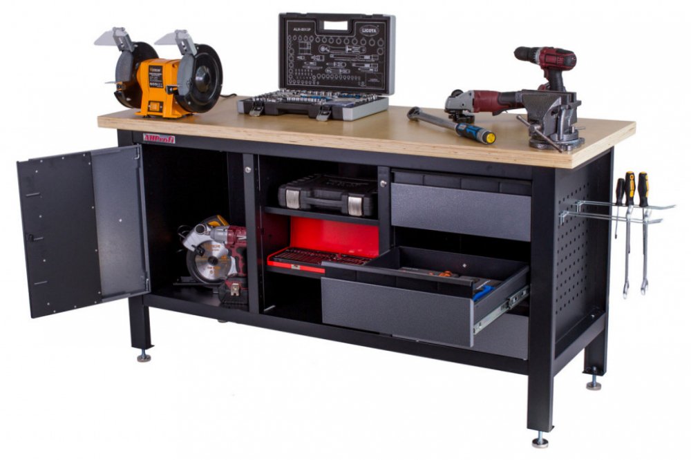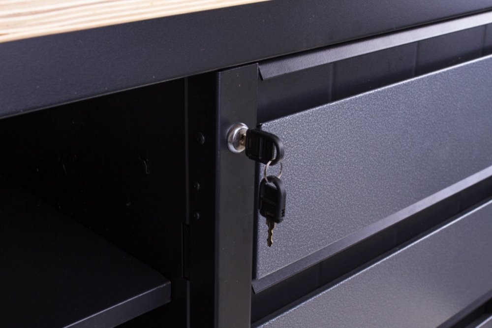 Uzamykatelná skříňka a zásuvky chrání nářadí před prachem i neoprávněným přístupem, otevřené regály poskytují rychlý přehled o obsahu. Po stranách jsou děrované desky pro zavěšení často používaného nářadí.