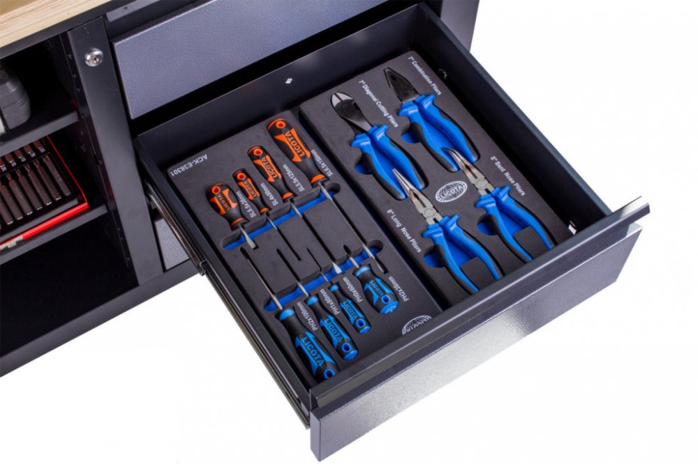 Do zásuvek lze přikoupit různé  výplně s nářadím, které přesně pasují do úložného prostoru. Ideální jsou například sady kleští nebo šroubováků.