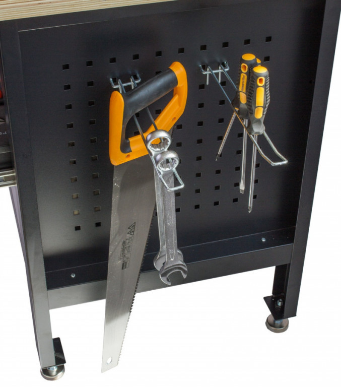 Na obou bocích je pracovní stůl vybaven děrovanou deskou. Díky tomu máte často používané nářadí stále po ruce a přehledně uspořádané.