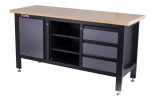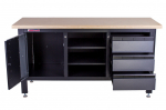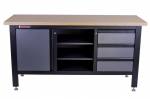 Kovový ponk o rozměrech 1690 x 865 x 600 mm. Dřevěná pracovní deska, skříňka, 3 šuplíky, 3 regály, děrované desky. Uzamykatelná skříňka i zásuvky. Nosnost pracovní desky 300 kg, odolná povrchová úprava. Celý popis