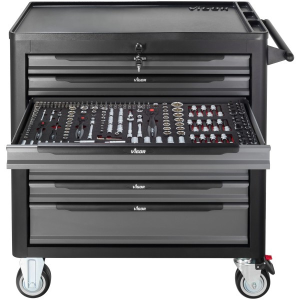 Součástí vozíku je 8 uzamykatelných zásuvek pro uložení výplní dílenského vozíku s ručním nářadím. Zásuvky jsou osazeny kuličkovými ložisky v pojezdech, čímž se zvyšuje jejich nosnost bez vlivu na výbornou vlastnost výjíždění/zajíždění.
