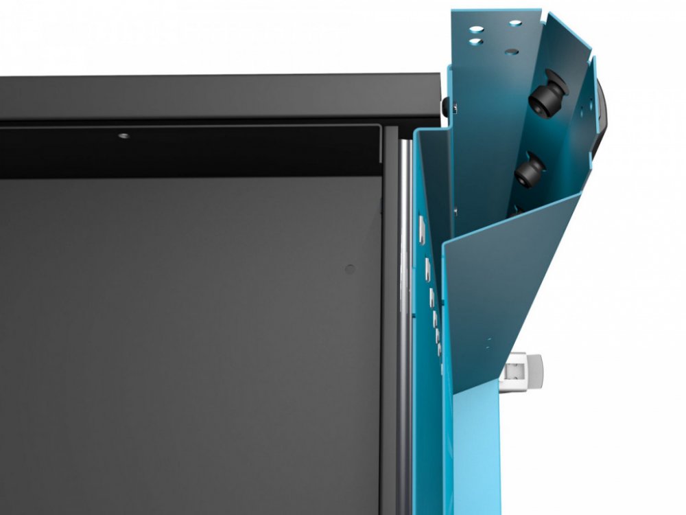 Na bočních stěnách vozíku nalezneme čtvercové děrování na které je možné pomocí háčků zavěsit další nářadí.